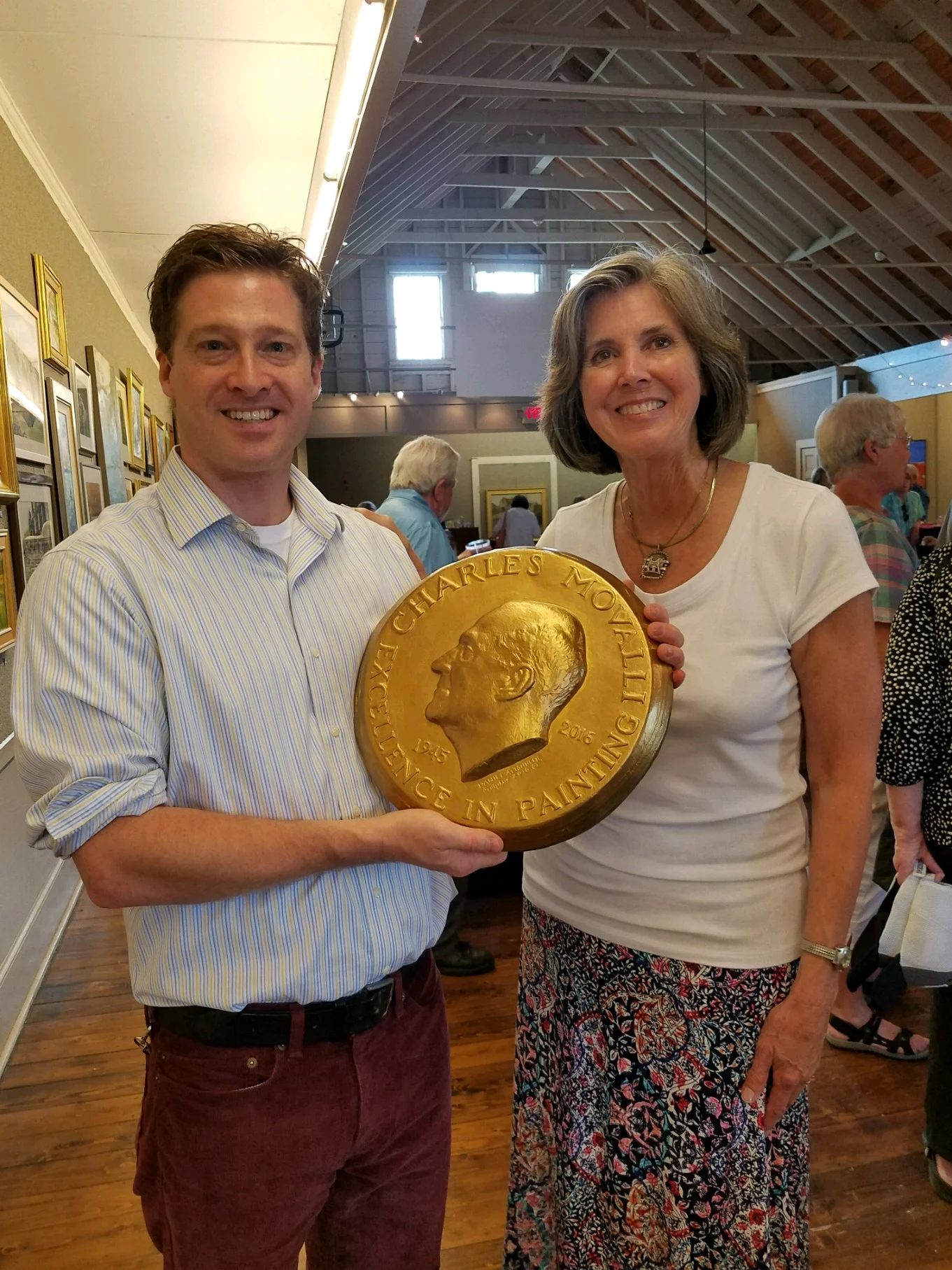 The first Charles Movalli Excellence in Painting Gold Medal award was given to Timothy Neill on Sunday, June 25th at the North Shore Arts Association in Gloucester, MA as part of the second summer juried exhibition. The medal shown in the photo is the full-size master, which is a stand-in for the scaled down 4" finished medal which is currently being cast in bronze. The wonderful design was created by sculptor Daniel Altschuler. In addition to the medal, recipients receive a $200 award.